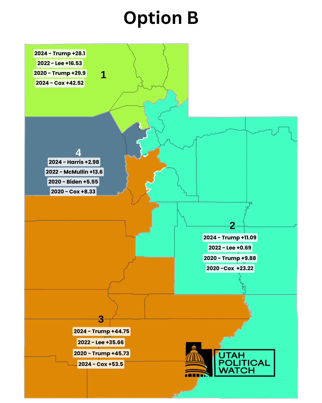 Republican Spencer Cox would have carried all four districts on every map during the 2020 gubernatorial contest by at least 8 points.