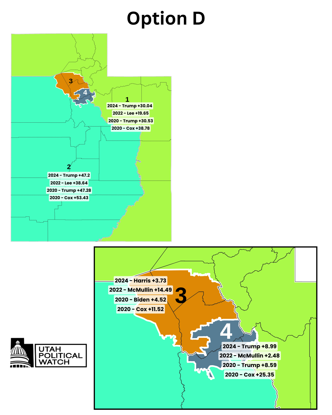Under map option C, Trump would have theoretically carried all four congressional districts in 2020 and 2024. However, two of those districts have the potential to become electoral battlegrounds, with his margin of victory under 7 points.