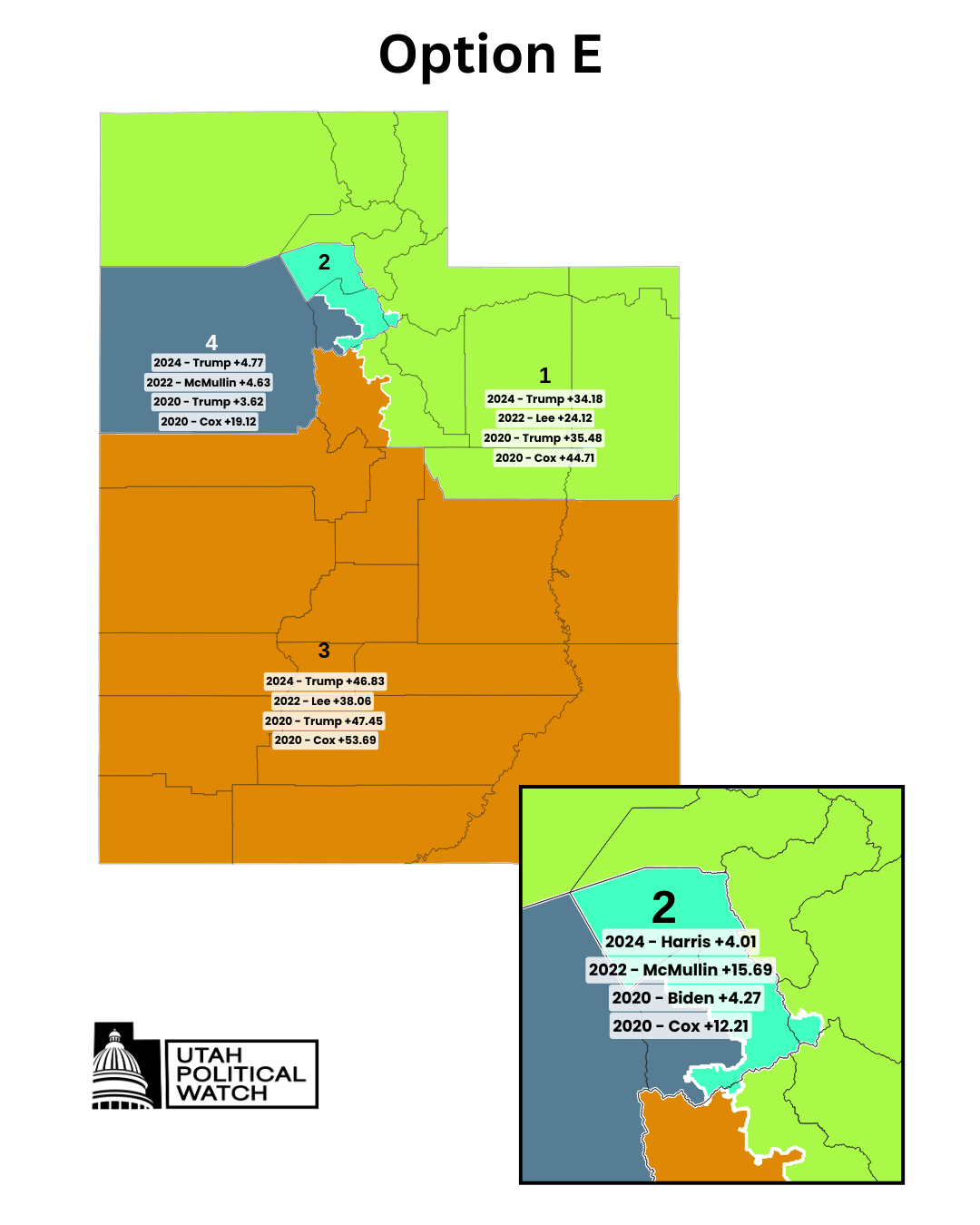 It’s not just presidential election results that suggest each of the map proposals could lead to competitive districts. Had the maps been in place during the 2022 U.S. Senate race, independent candidate Evan McMullin would have carried at least one district on each map and would have prevailed in two districts under map proposals A, C, D, and E.