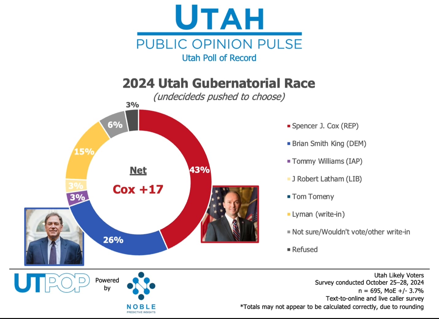 A Noble Predictive Insights poll released Wednesday shows Spencer Cox leading king by 17 points, 43% to 26%. Lyman is in third place, pulling 15% support.