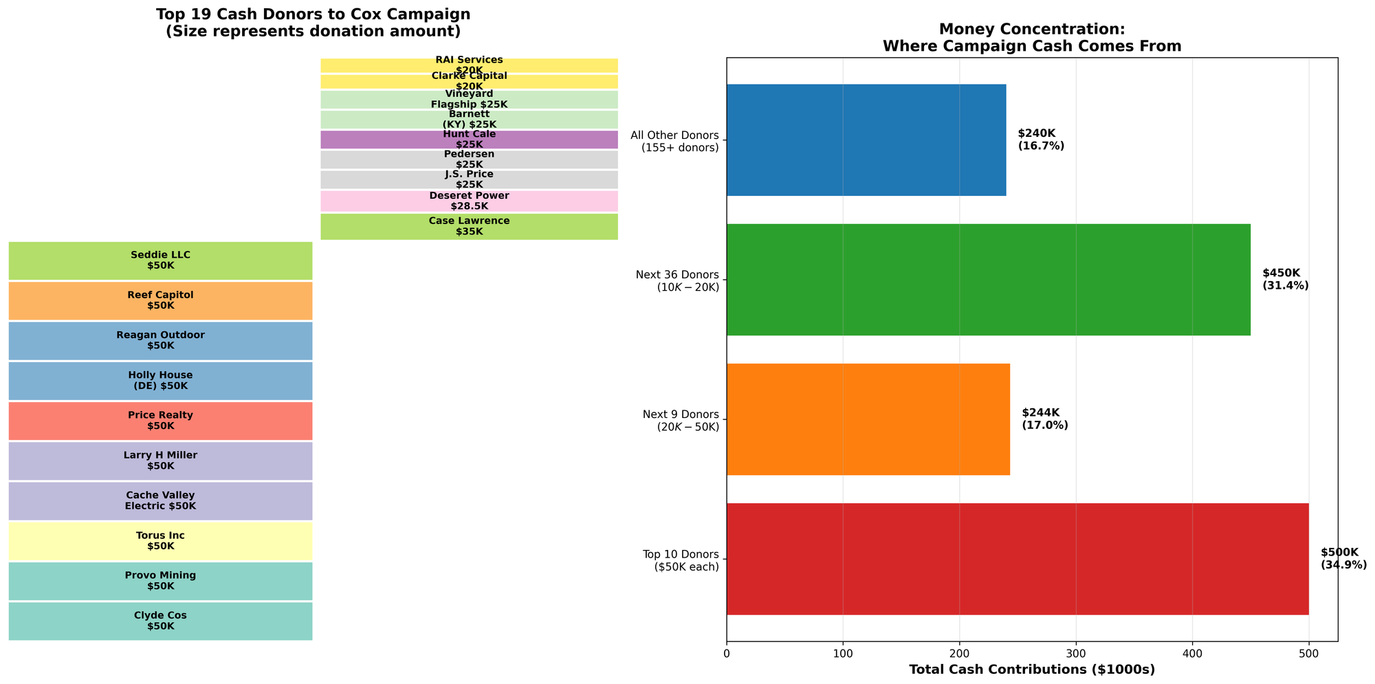 Cox listed several high-profile individual donors on his disclosure, including real estate developer J. Steven Price ($25,000), entrepreneur and former congressional candidate Case Lawrence ($35,000), and Vivint founder Todd Pedersen ($25,000).