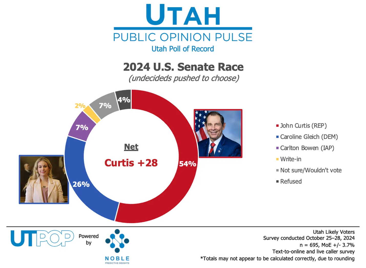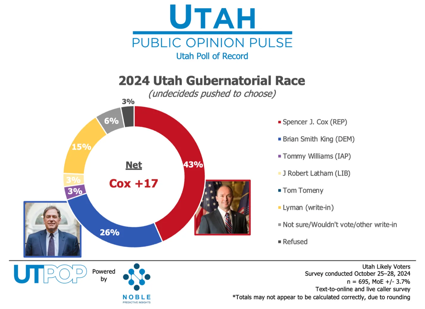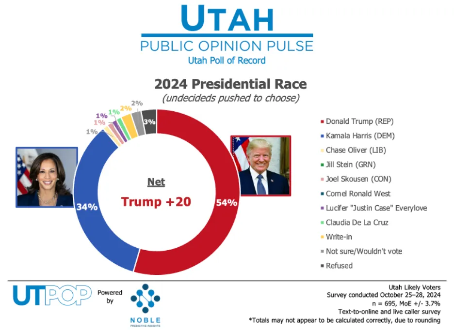 The survey was conducted Oct. 25-28 among 695 likely Utah voters. It has a margin of error +/- 3.7%.
