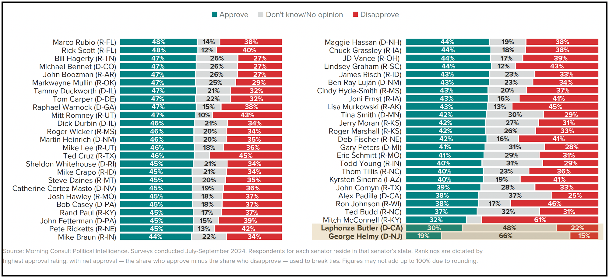 Romney's disapproval rating is among the highest in the Senate. Only Sens. Lindsey Graham, Ted Cruz, Lisa Murkowski, Ron Johnson, and Mitch McConnell have higher disapproval than Romney.