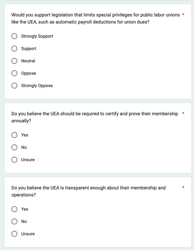 - “Would you support legislation that limits special privileges for public labor unions like the UEA, such as automatic payroll deductions for union dues?”