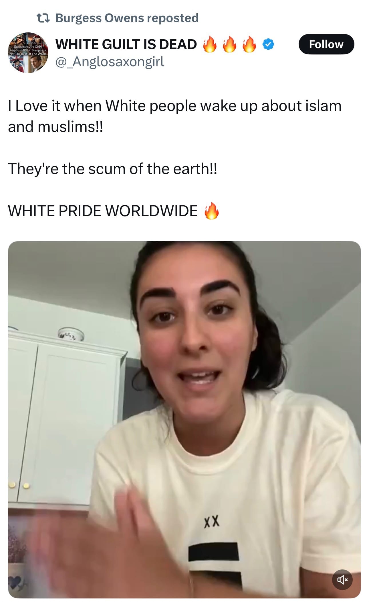 The video continued with a string of inflammatory accusations against Muslim immigrants, claiming they "hate women, children, white people, America, and Western civilization."