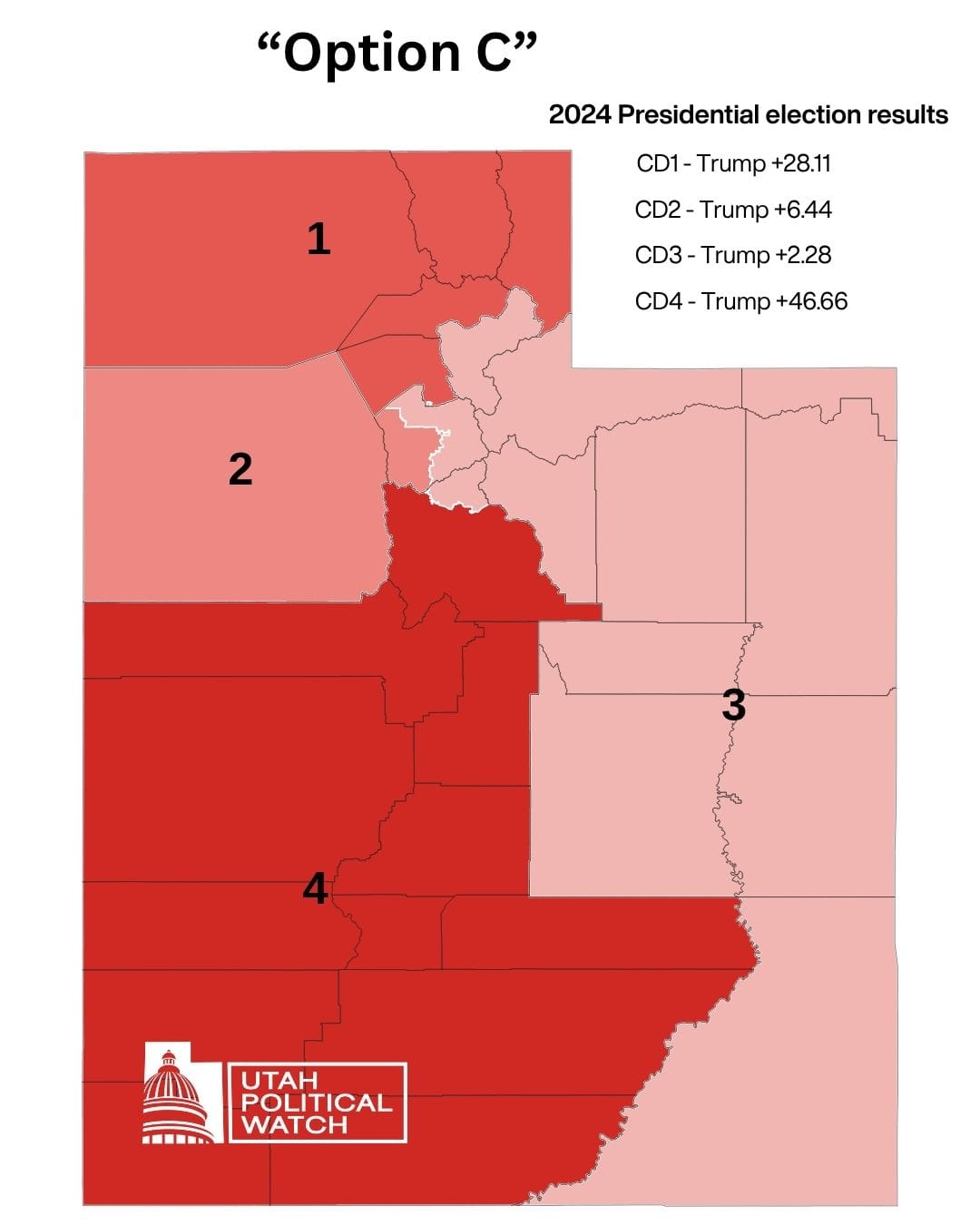 An analysis by Utah Political Watch of the legislature’s proposed map finds two districts that could be competitive for a Democrat. On that map, Donald Trump carries all four districts based on the 2020 and 2024 results, but his margin of victory is under 7 points in two of them.