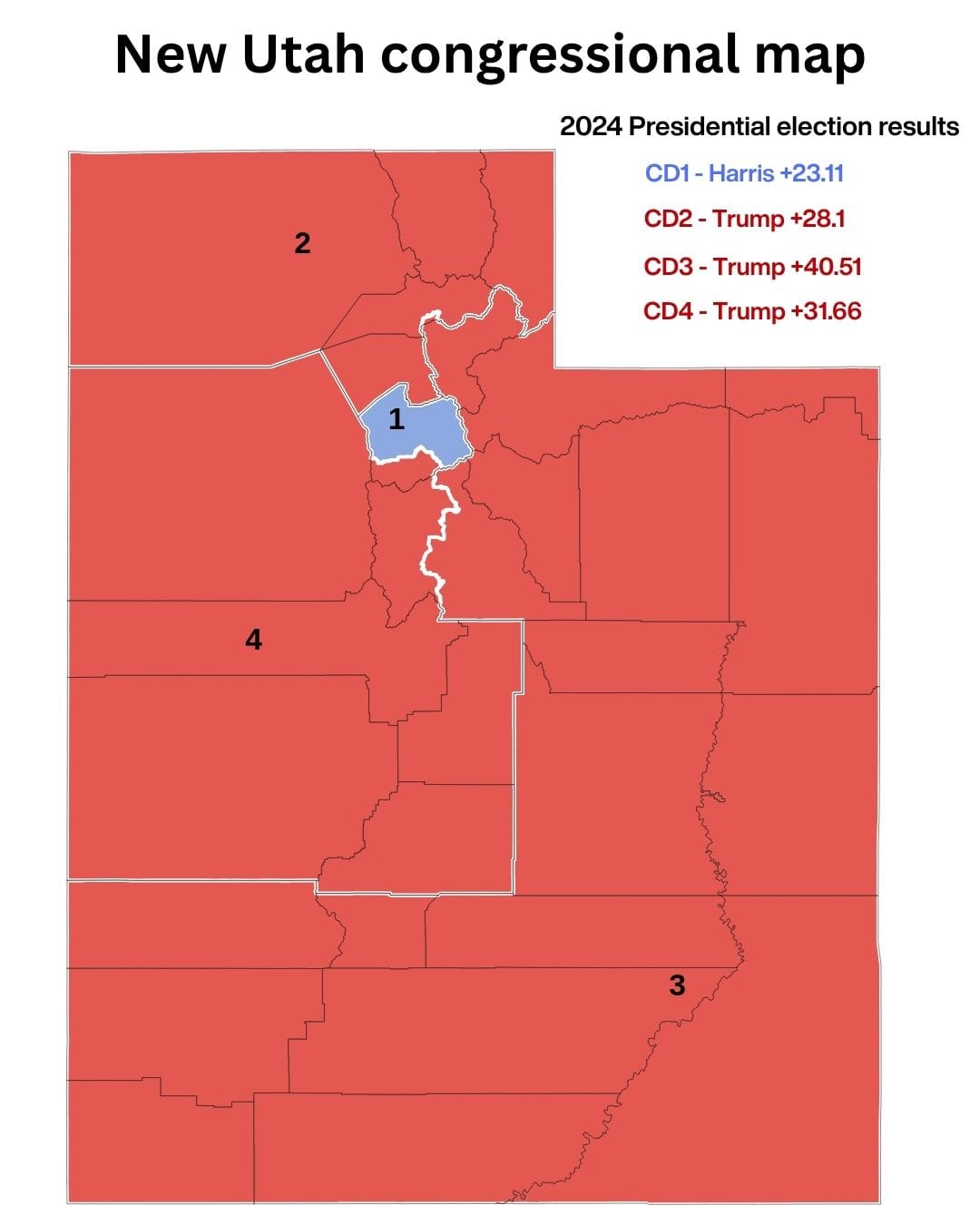 In adopting the plaintiffs’ map, Gibson said it “does not exhibit partisan favoritism,” even though the Salt Lake County–centered district would have gone for Democrat Kamala Harris by more than 23 points in 2024—which suggests a safe Democratic seat.